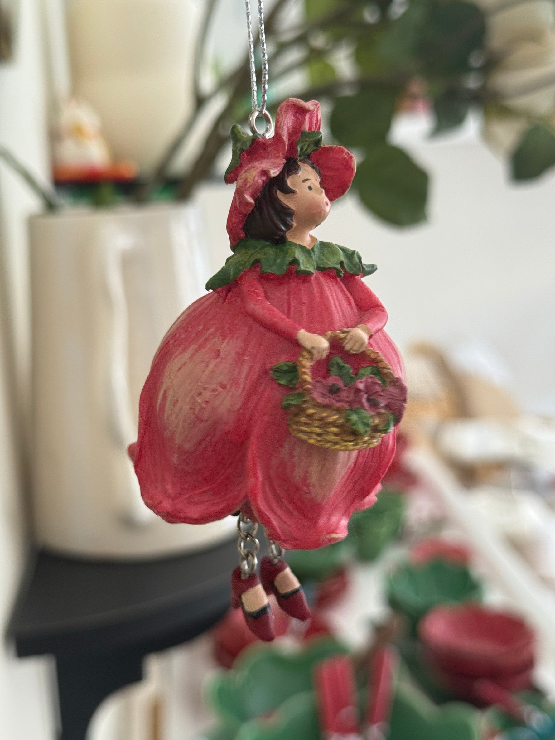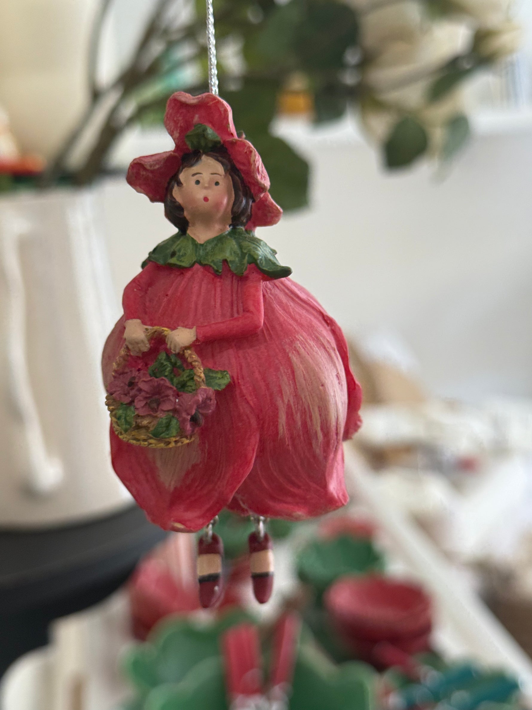 Pear • Strawberry • Red poppy • Pink poppy • Yellow echinacea • Pink peony • Geranium • Dahlia • Hydrangea • White and green tulip • Pink rose • Red rose