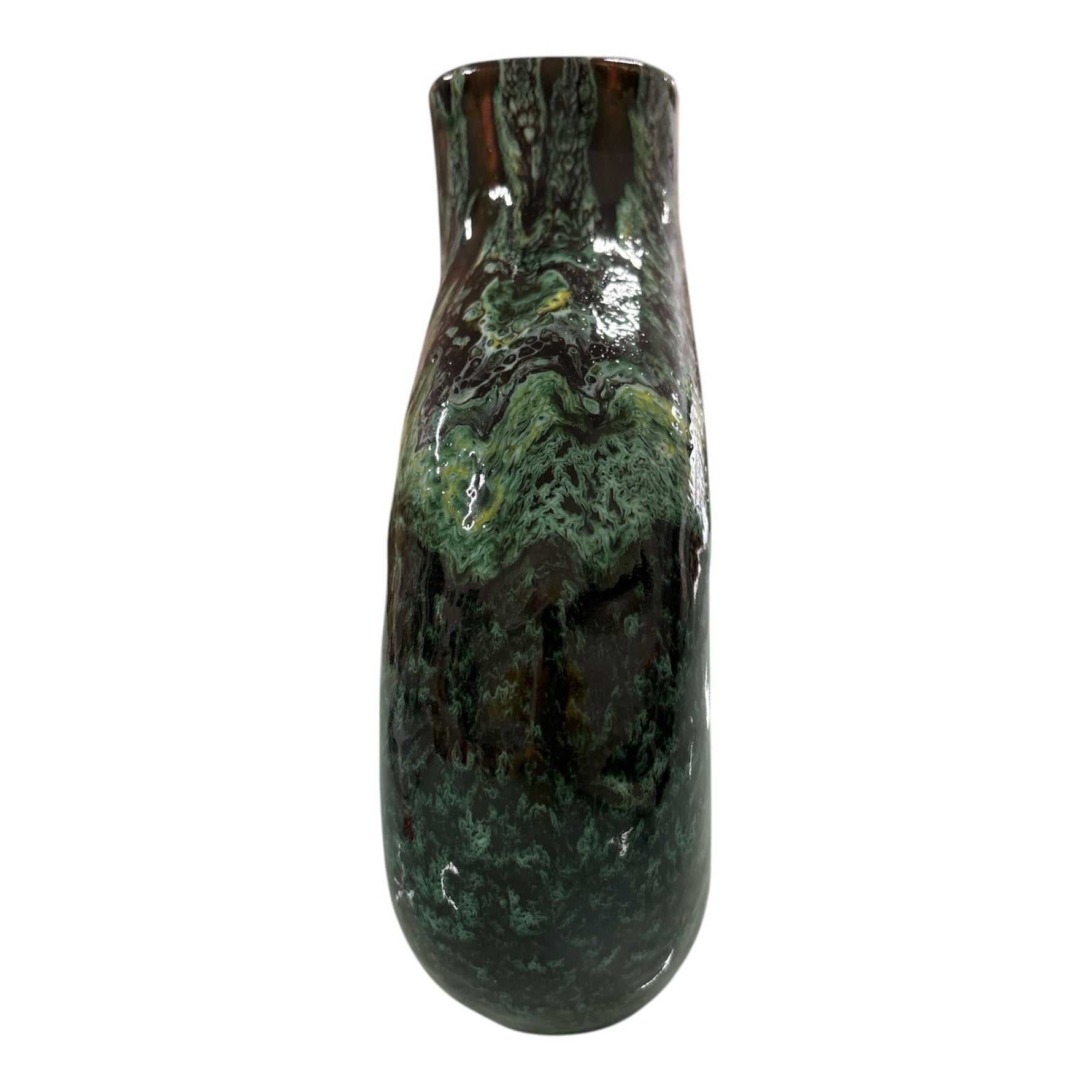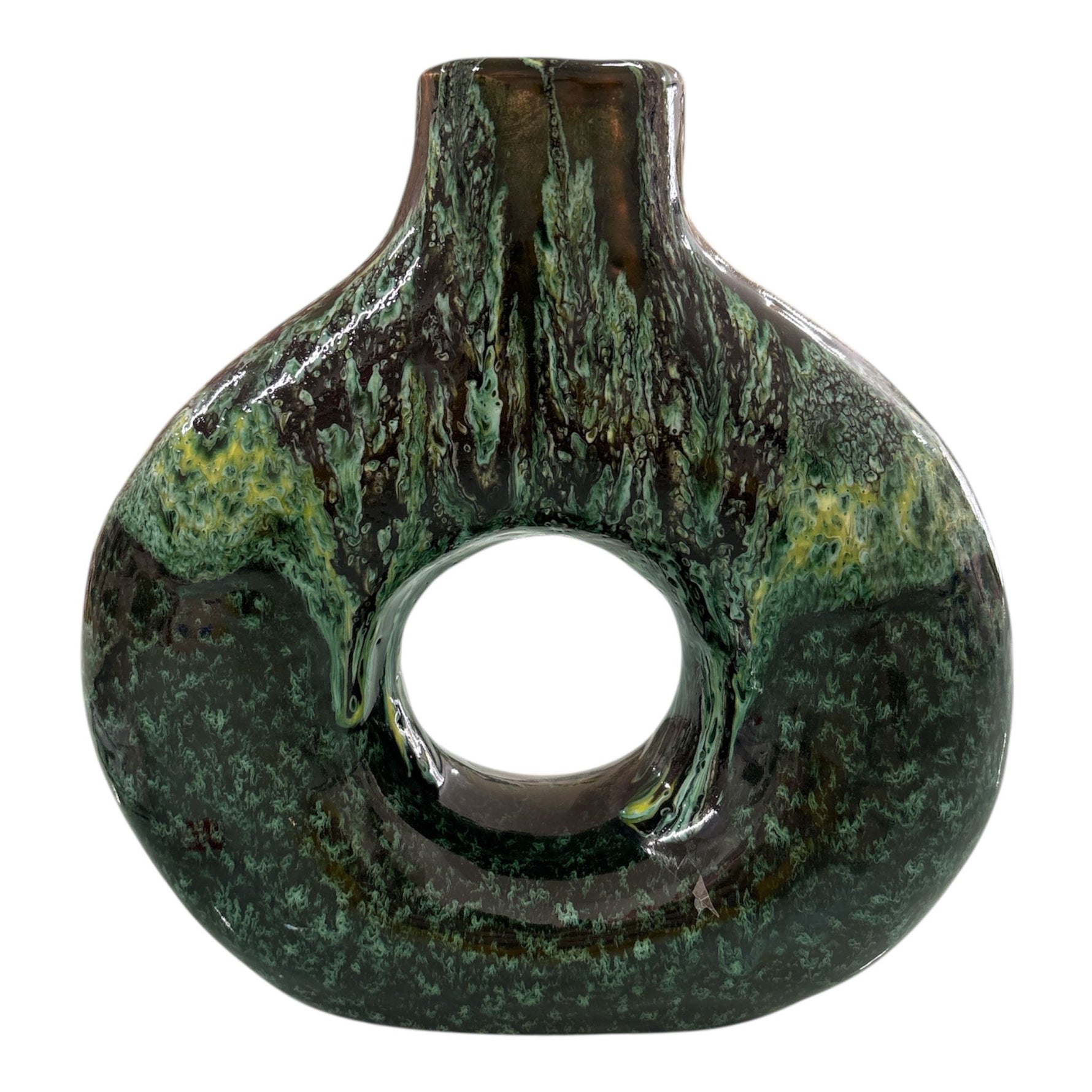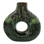 Made of handcrafted ceramic , this vase stands out for its soft and harmonious silhouette, embellished with a glossy finish in green and brown tones that recalls mineral veins and natural landscapes.