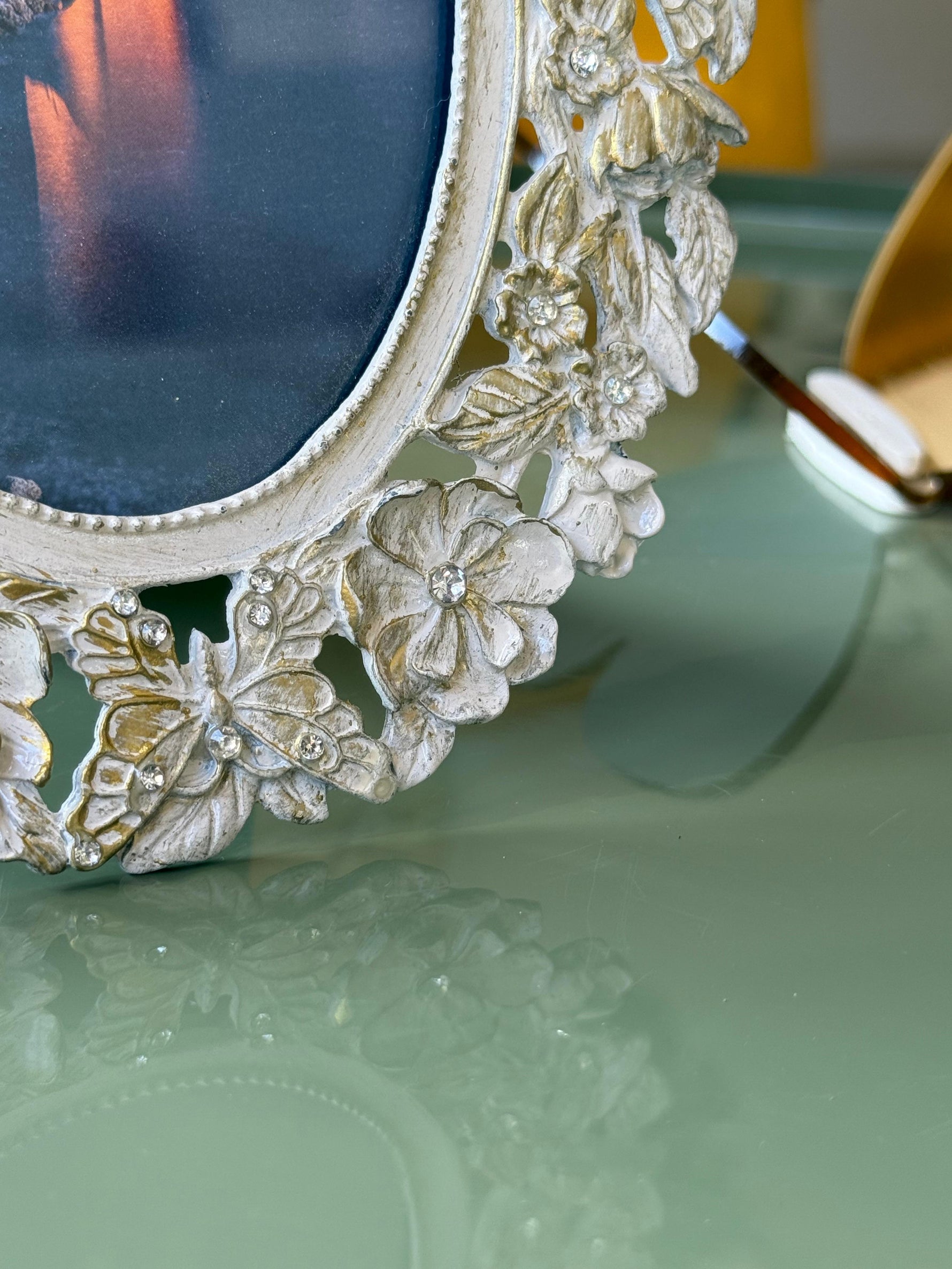 Unit price / perThe Meander oval frame is a refined decorative object that transforms your photos into authentic jewels for display. Crafted with attention to detail, it features embossed flowers and butterflies , embellished with small, sparkling appliqués that add light and sophistication.