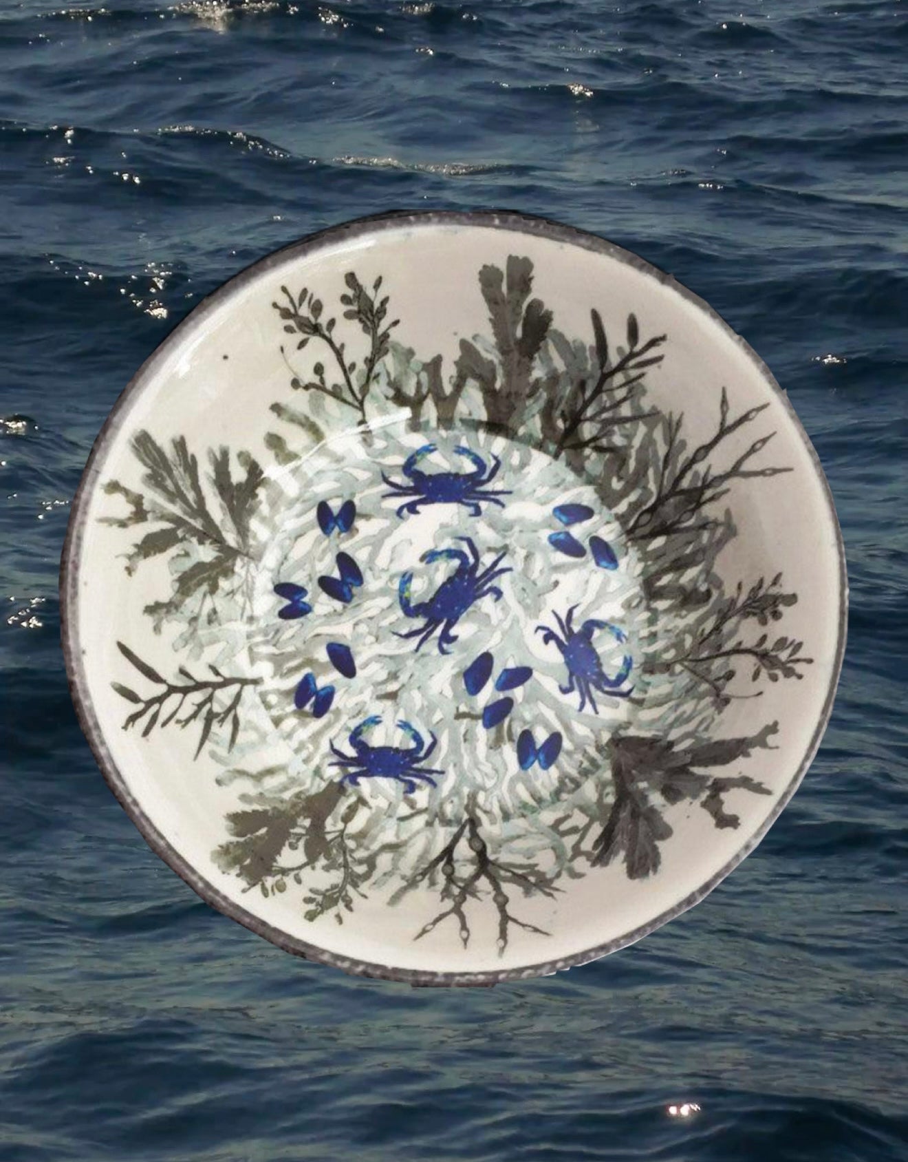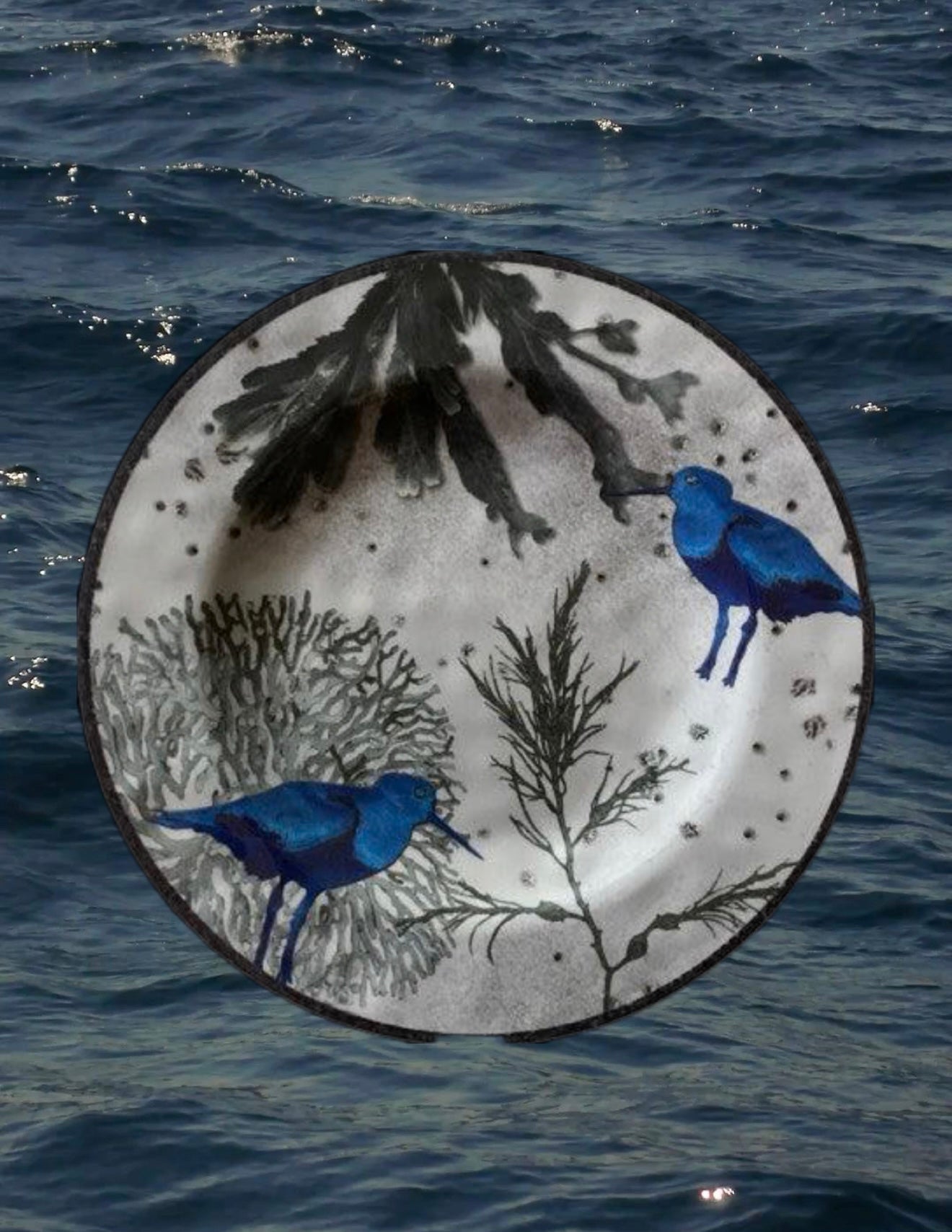 Each item in the service is decorated with different marine motifs , inspired by coral, seaweed and sea birds, painted in shades of blue, grey and sand that evoke the calm and depth of the ocean.